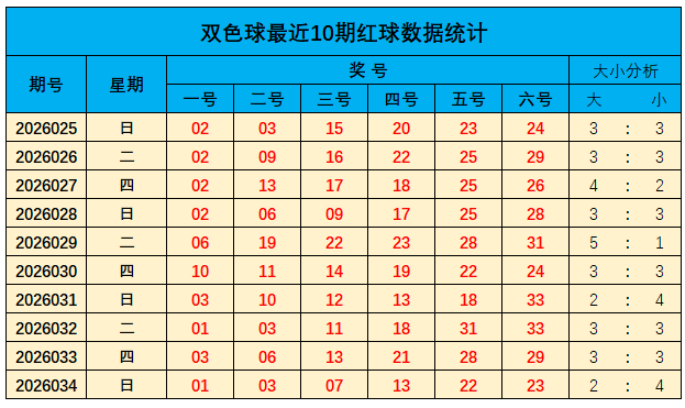 上期红球大小比为2:4,近10期大小比为31:29;总体上大奖号走势稍热,本期关爱大数较上期走势升温,保举大小比为:4:2