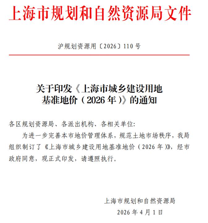 时隔六年,上海地皮“基准价”迎来迂回。4月2日,《上海市城乡建立用地基准地价(2026年)》公布,基准日从2020年1月1日更新至2026年1月1日。