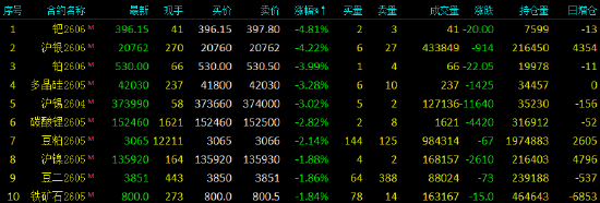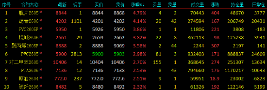 2026年3月16日,国内商品期货开盘,瓶片、沥青主力合约涨超4%,PVC、烧碱、聚丙烯涨超3%。沪银跌超4%,沪锡跌超3%,豆粕跌超2%。