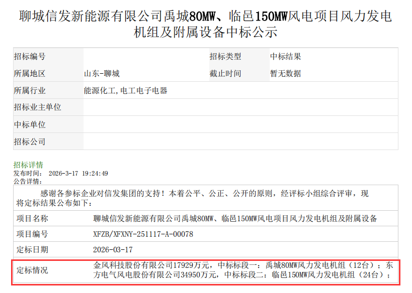 公示泄露:金风科技股份有限公司17929万元,中标标段一:禹城80MW风力发电机组(12台);东方电气风电股份有限公司34950万元,杠杆炒股平台中标标段二:临邑150MW风力发电机组(24台)。
