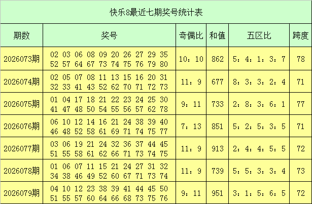 福彩舒畅8第2026079期开出奖号:04 10 12 23 38 39 41 44 45 50 51 55 57 60 64 66 68 73 75 76,其中奖号奇偶比为9:11,和值为951,跨度72,五区比为3:1:5:6:5。