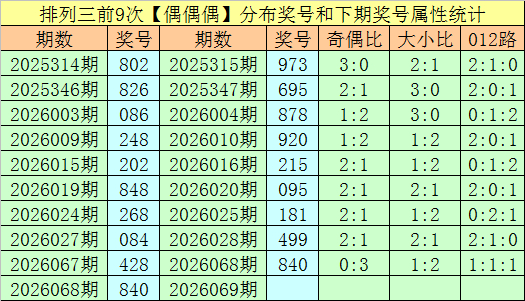 陈列三第2026068期奖号为840,直选奇偶漫衍为:偶偶偶,该奇偶漫衍历史上共出现了982次,前100期出现9次。