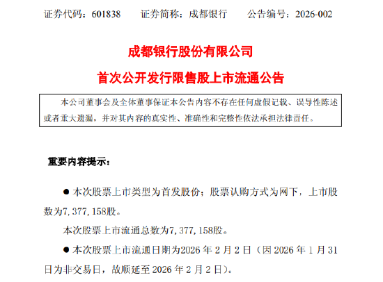 趣富配资 成都银行:738万股首发股份将于2月2日上市流通